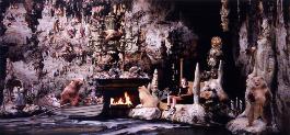| Some are cozy, like the cave. It has bears in rowboats and even a picture window where you can see the light coming in from the outside. |